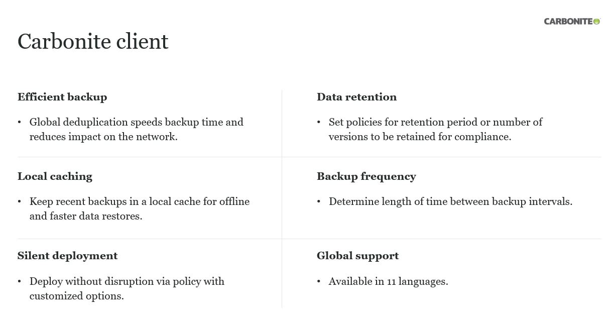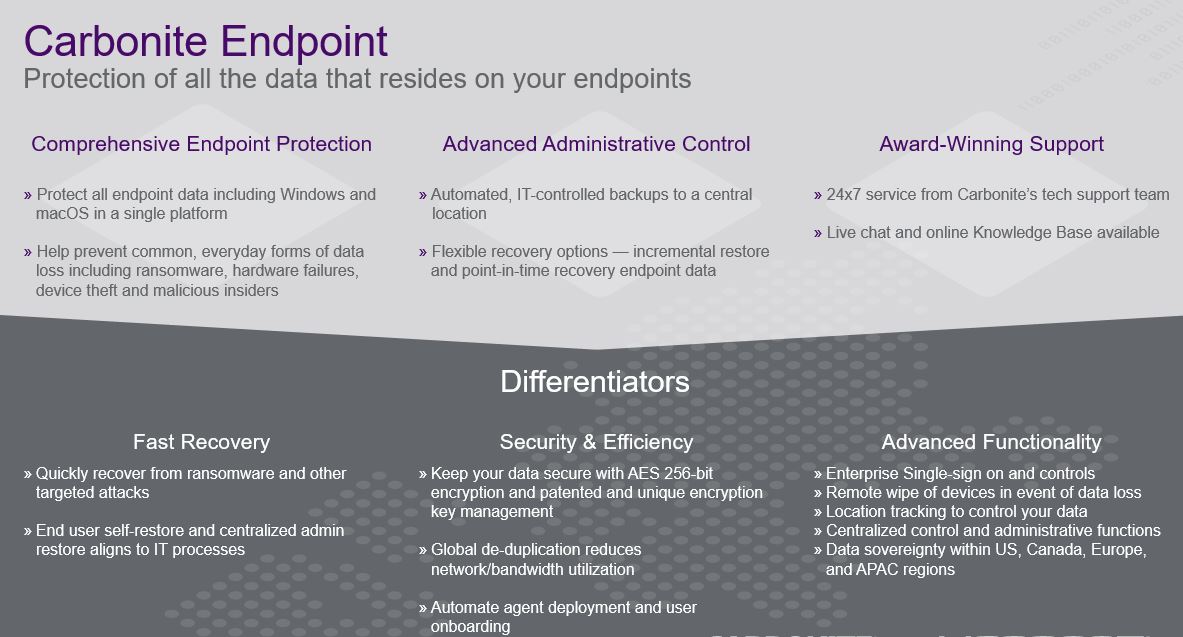 With Carbonite® Endpoint, organizations have complete confidence they can back up data on their laptops and desktops and recover it easily after any data loss event.