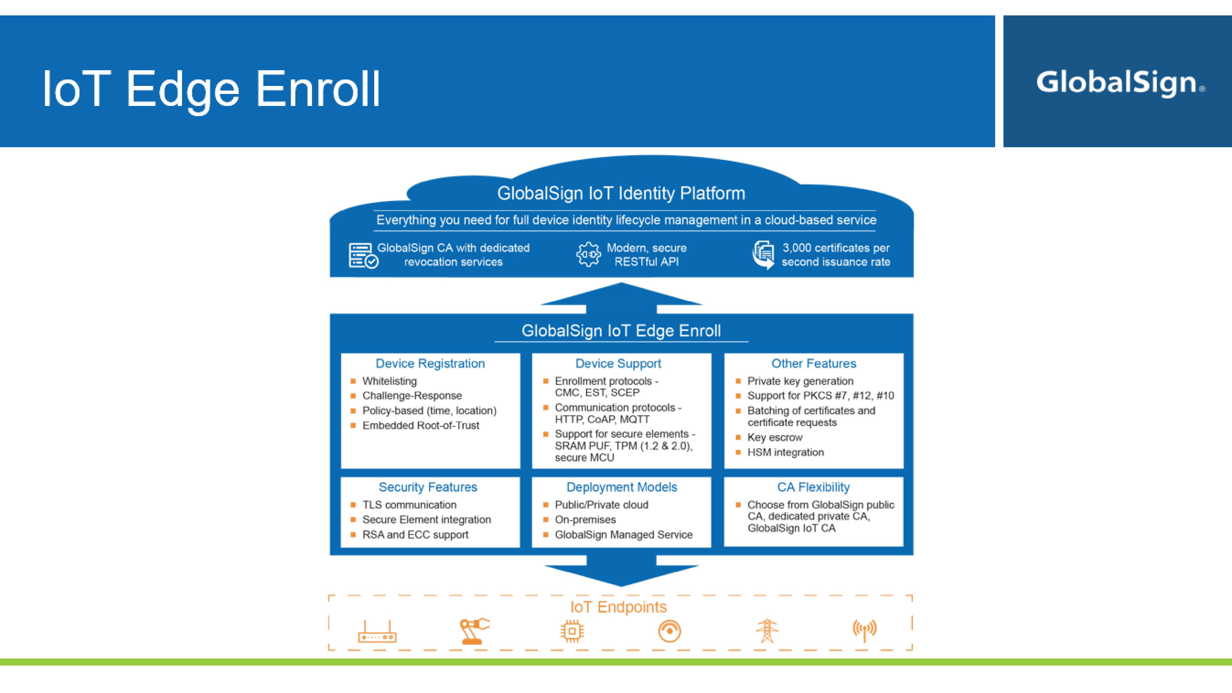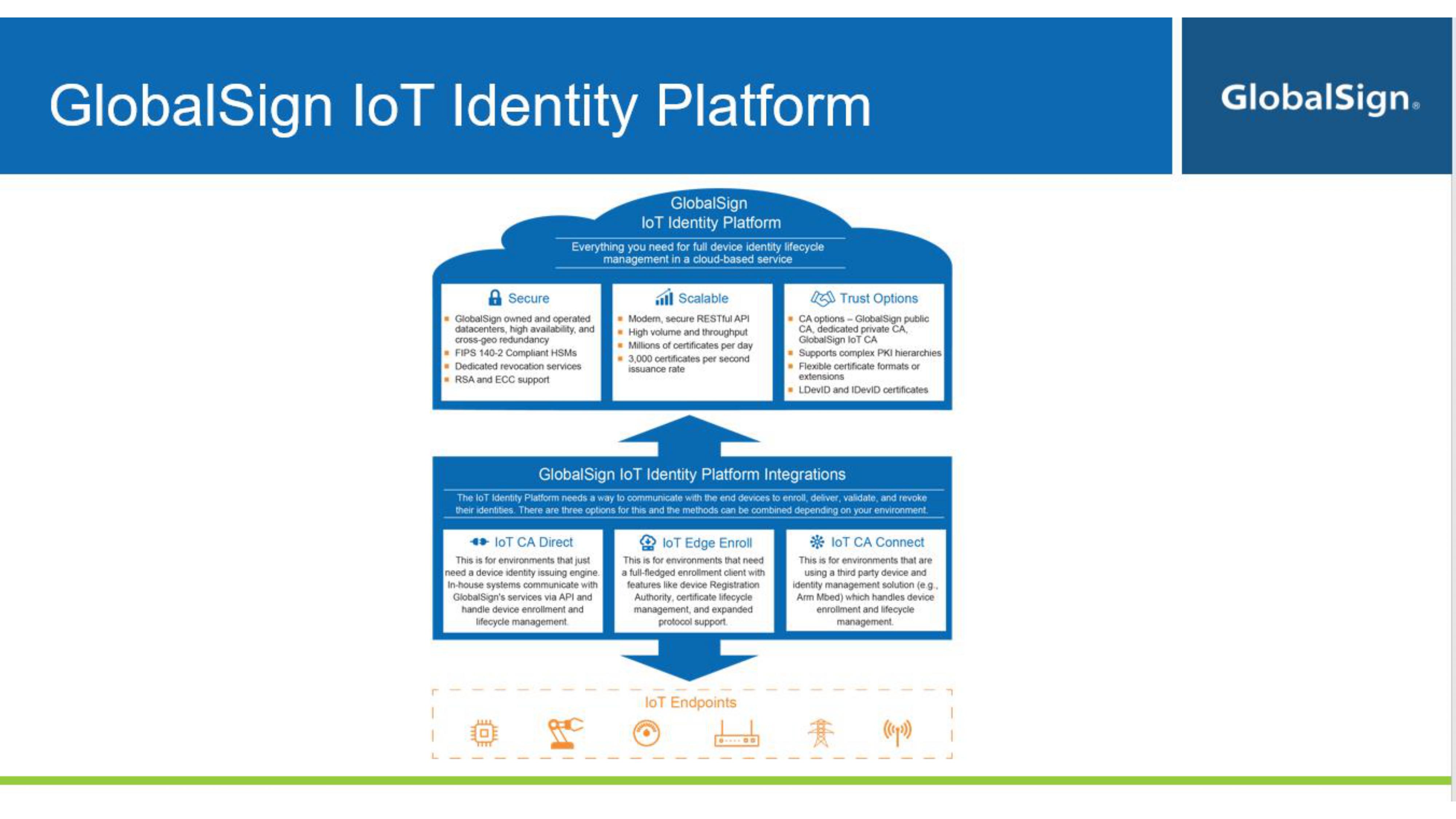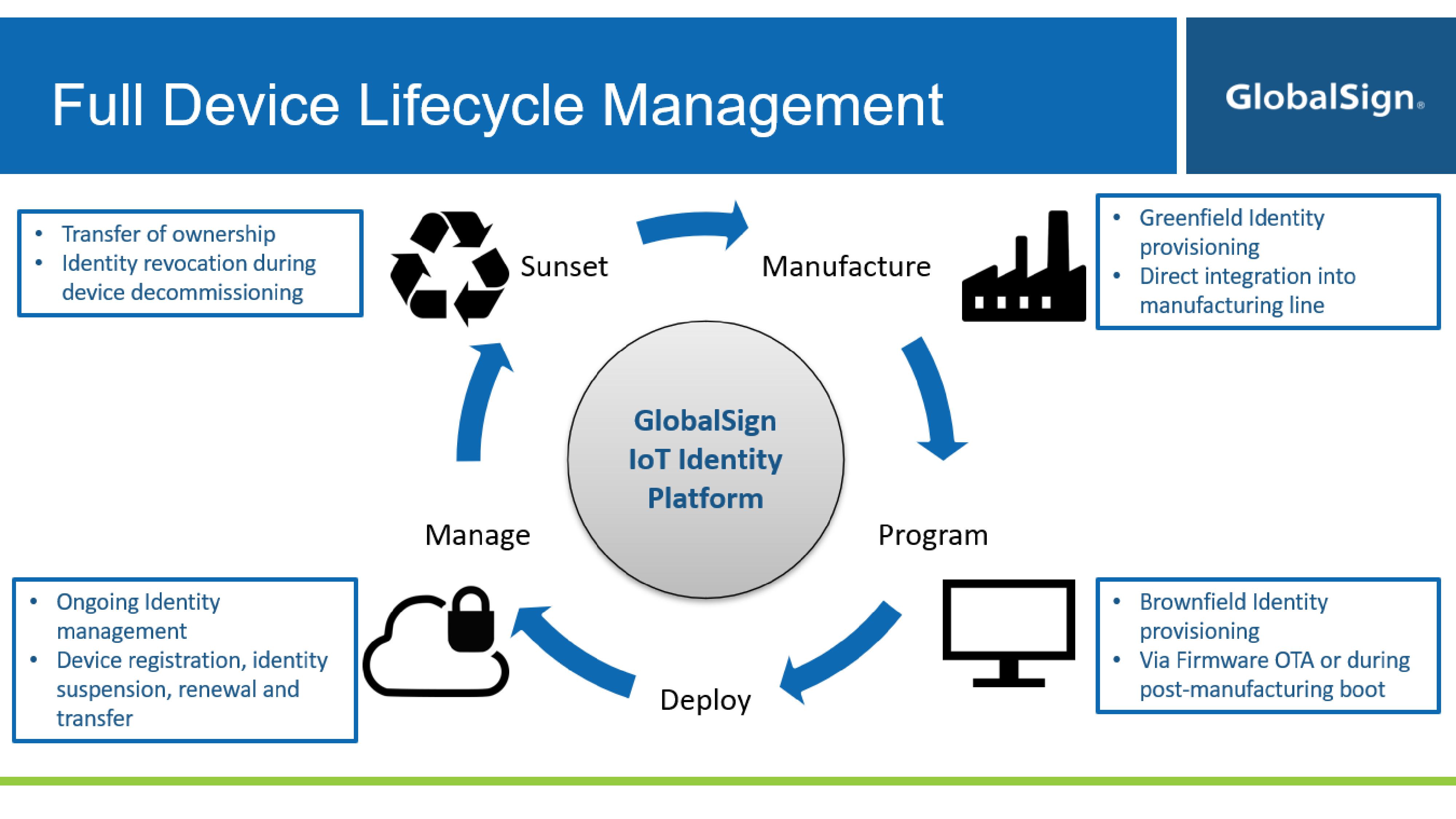 GlobalSign’s next-generation IoT Identity Platform delivers everything you need for full device identity lifecycle management from design and manufacturing, through deployment, management and sunsetting.