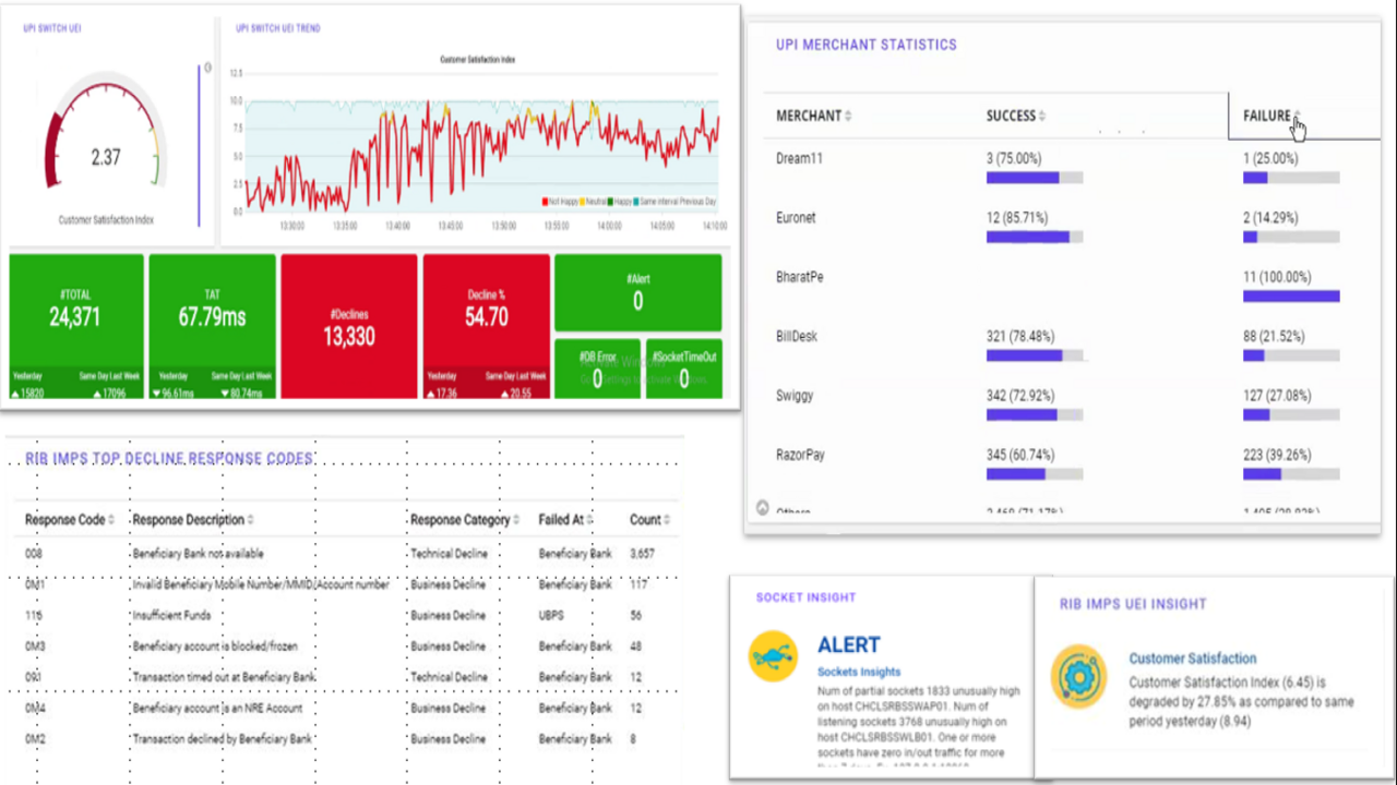 VuNet has built ground up a next generation full stack platform vuSmartMaps, infused with big data and machine learning in innovative ways to give AI generated business contextualized insights on operations and digital payments data, improving revenue potentials from optimized TATs and reducing costs through faster error detection and cause isolation. Our next generation systems are helping the largest financial institutions to improve their digital payment experience, driving more financial inclusion across the country by monitoring various payment transactions such as UPI, IMPS, RuPay, ACS(OTP), AePS, BillPay, ATM, NACH etc.
