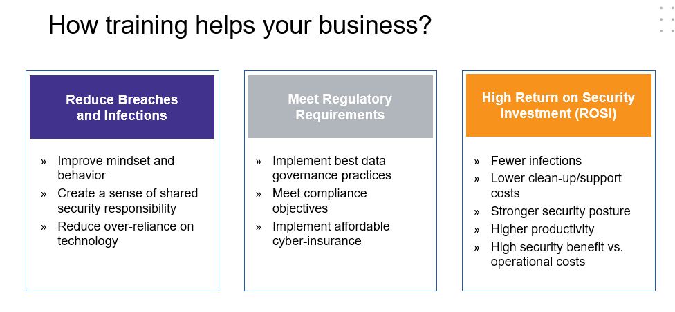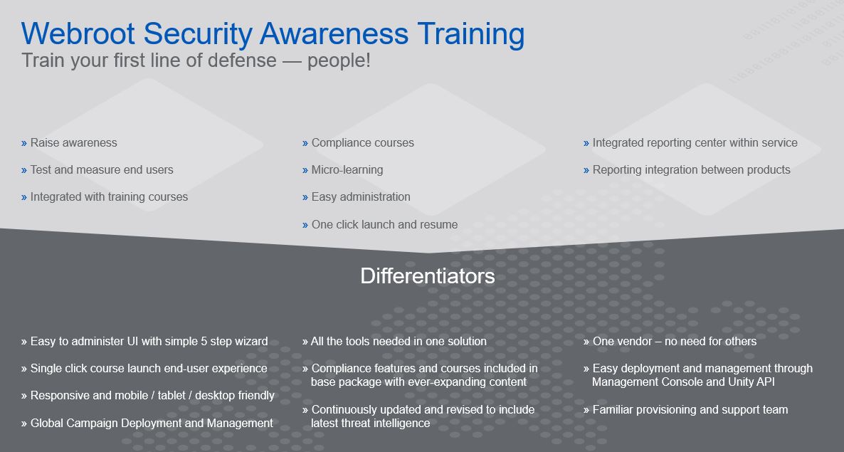 Webroot® Security Awareness Training offers comprehensive and affordable cybersecurity education for your end users. Training consists of simple, easyto-run courses and campaigns that minimize user-generated risks and help reduce infection rates, thereby driving down your remediation costs and reducing the overall risk to your business. Secondarily, implementing Webroot Security Awareness Training can help your business fulfill many of the regulatory compliance requirements specific to certain industries.